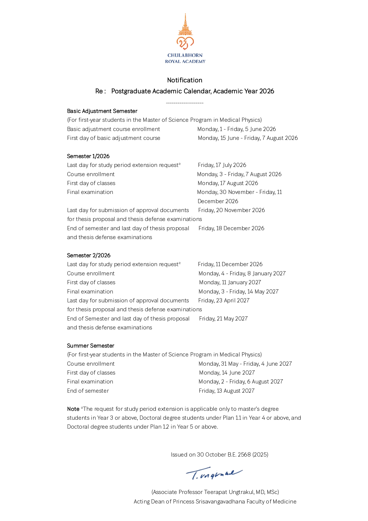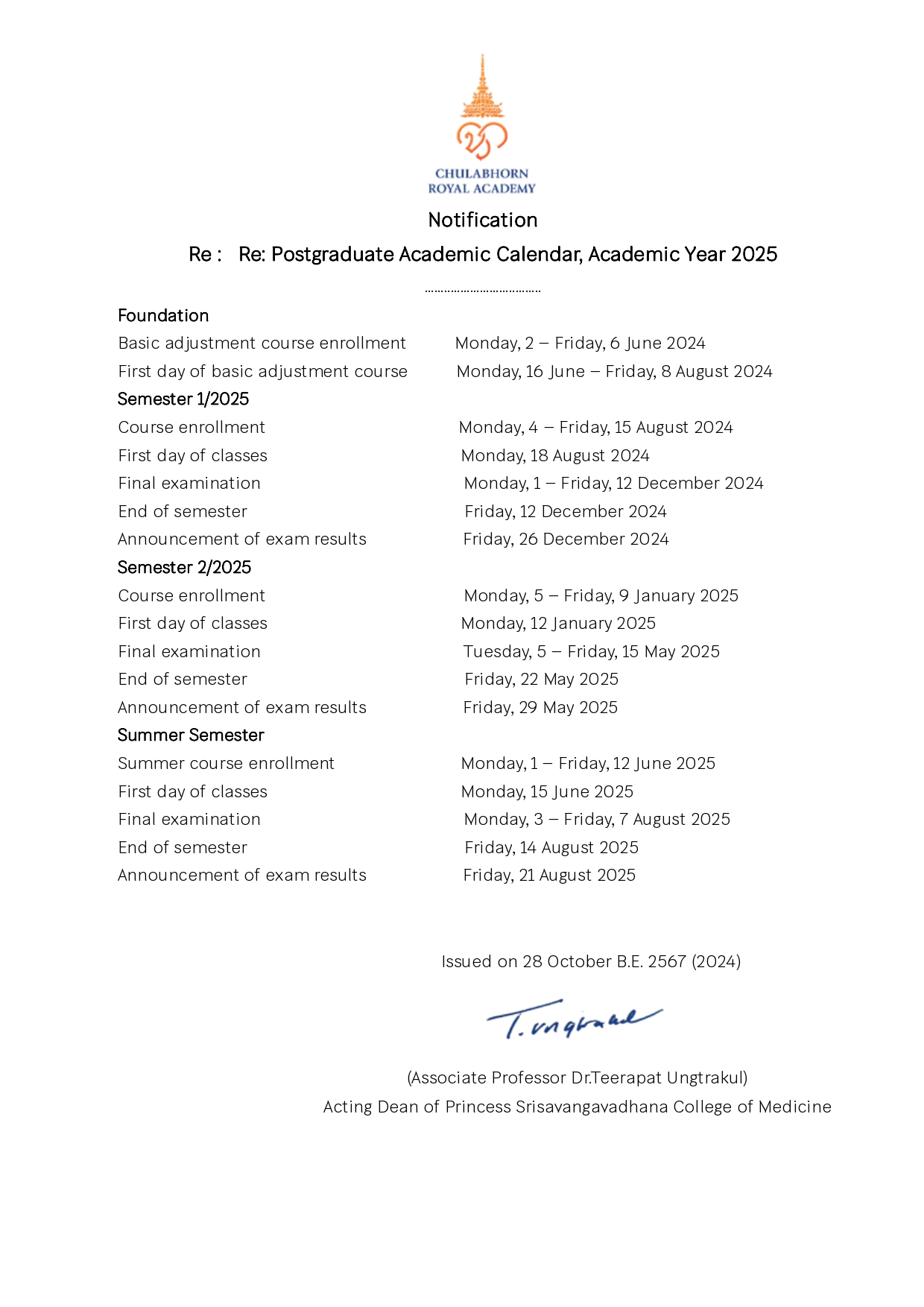 - Announcement of Chulabhorn Royal Academy on English Proficiency Requirements for Graduate Students. 2025 : Click